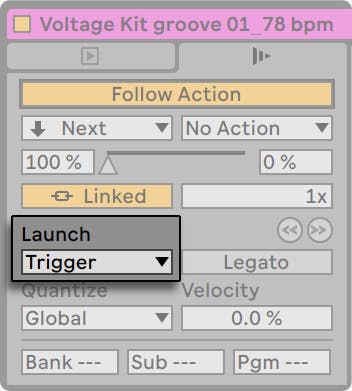 • Repeat: As long as the mouse switch/key is held, the clip is triggered repeatedly at the clip quantisation rate.