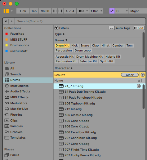 - go into the browser, “Drums”, filter by Drum Kit: