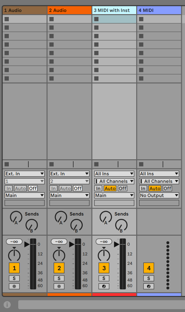 If put an instrument on a MIDI track, it will look different, because now there is actual sound coming out. It looks similar to an audio track, except the input section and the arm button on the bottom has a note symbol: