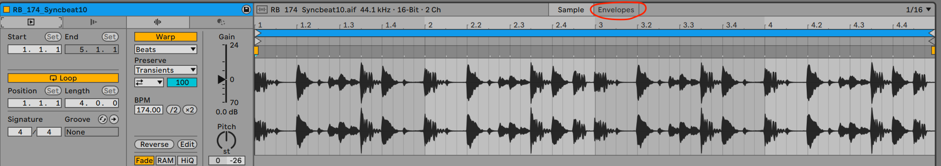 e.g. you have a drum loop sample where you really like the sound of the backbeat, but you don’t want to have the whole beat playing. That is a great example of how you can use clip envelopes.