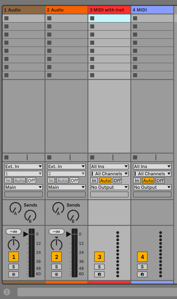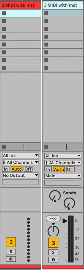 If put an instrument on a MIDI track, it will look different, because now there is actual sound coming out. It looks similar to an audio track, except the input section and the arm button on the bottom has a note symbol: