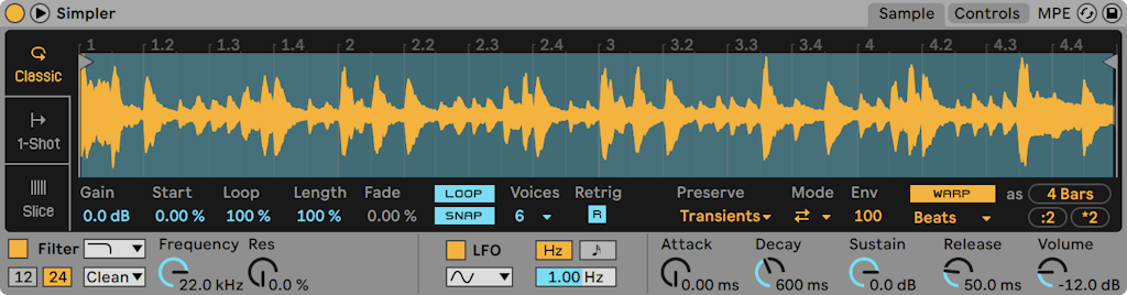 In Ableton this device is called SIMPLER and you’ll find it in the INSTRUMENTS category in the browser. Download this set to follow along: